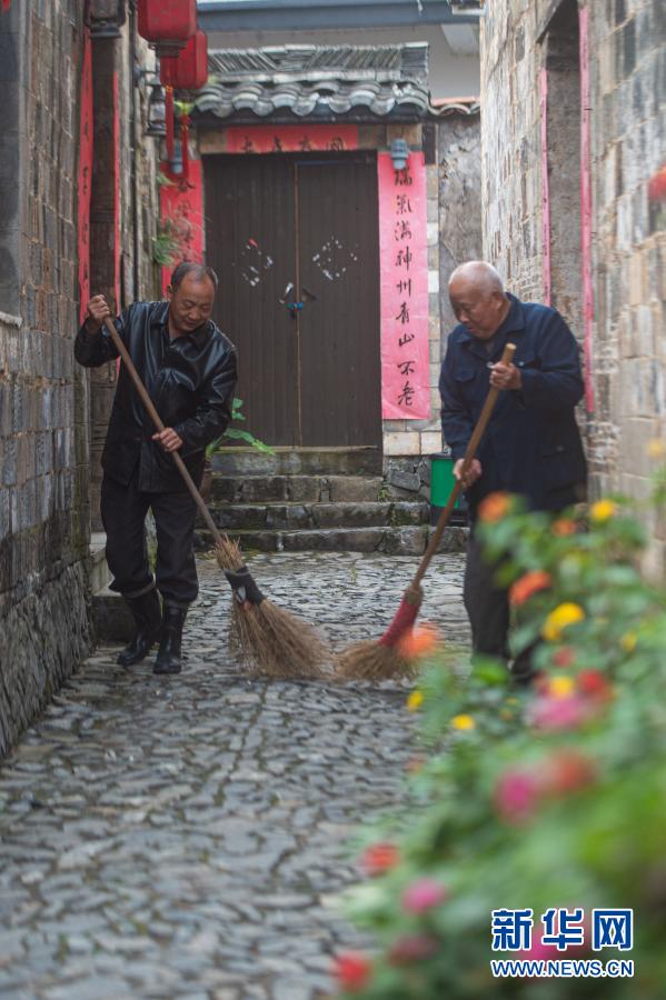 11月17日,大陳村村民汪須倉(左)、汪巖宣義務(wù)打掃村內(nèi)的石板路。從2005年起,大陳村號召村民“美村必先潔家”,義務(wù)打掃也逐漸成為大家的一種習(xí)慣。新華社發(fā)(江漢 攝)
