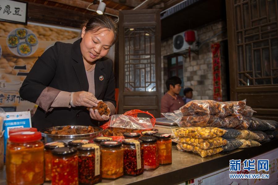11月17日,大陳村村民汪曉玲在自家經(jīng)營的土特產(chǎn)店內(nèi)整理新鮮出爐的地瓜干供游客挑選。新華社發(fā)(江漢 攝)
