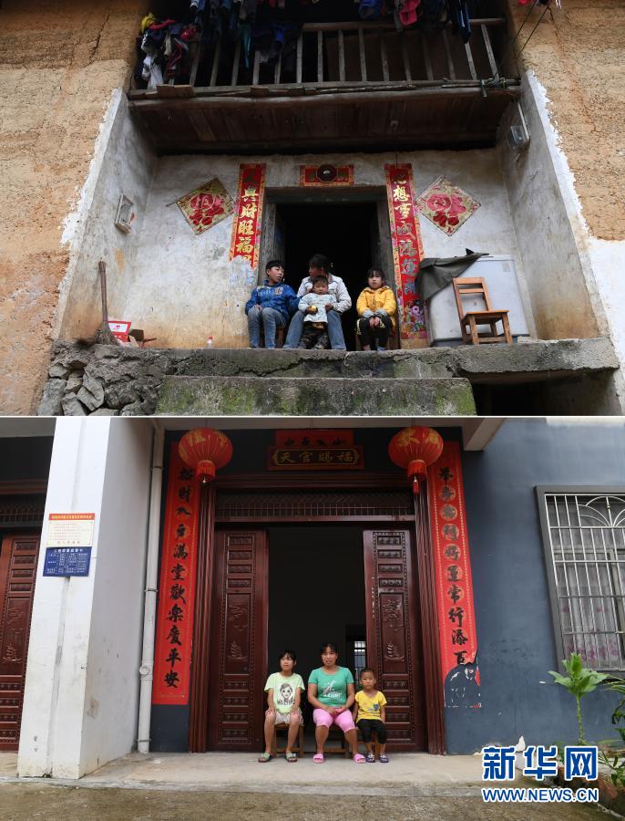 這是一張拼版照片。上圖:在廣西都安瑤族自治縣下坳鎮(zhèn)加八村,白雨璐(右一)和家人坐在家門口(2017年2月9日攝);下圖:在下坳鎮(zhèn)車家莊扶貧搬遷安置新區(qū),白雨璐(左一)和家人坐在家門口(8月18日攝)。新華社記者 陸波岸 攝