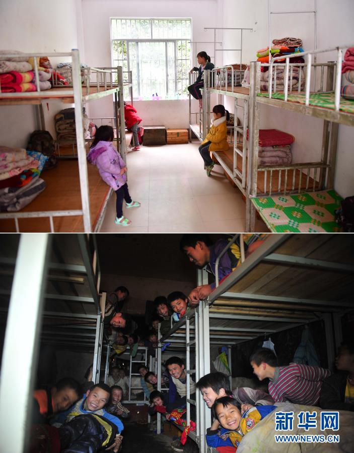 這是一張拼版照片。上圖:在大化瑤族自治縣板升鄉(xiāng)弄勇小學,同學們在新宿舍里(2019年5月8日攝);下圖: 2012年12月26日,在弄勇小學,同學們擠在10多平方米的“大通鋪”上準備睡覺。新華社記者 黃孝邦 攝