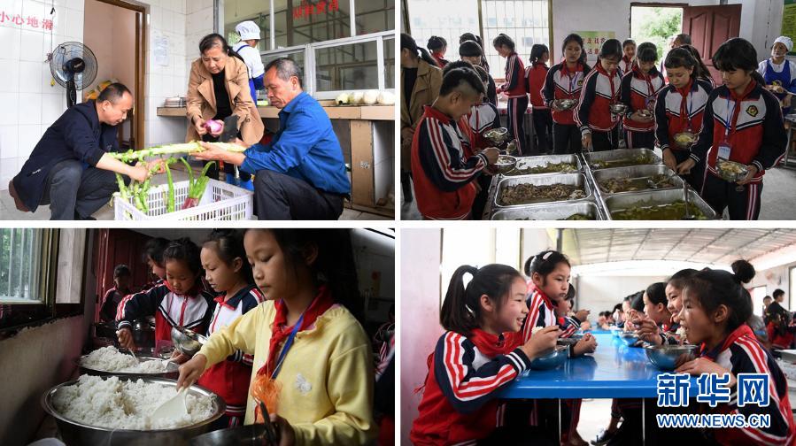 這是一張拼版照片。上左:在融水苗族自治縣東陽村小學,廚房師傅們在準備營養(yǎng)午餐;上右:東陽村小學學生根據(jù)需要挑選菜肴。下左:東陽村小學學生排隊打飯;下右:東陽村小學學生在食用營養(yǎng)午餐。近年來,廣西在貧困地區(qū)大力推行學生營養(yǎng)餐,幫助貧困學生健康成長(2019年5月6日攝)。新華社記者 張愛林 攝