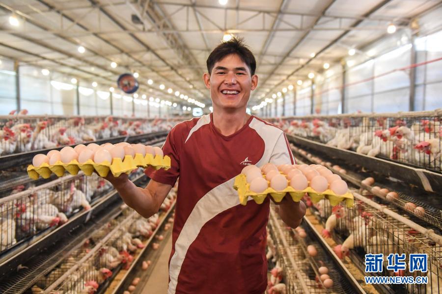 廣西武宣縣金雞鄉(xiāng)仁元村的返鄉(xiāng)創(chuàng)業(yè)者覃永靈在養(yǎng)殖場內(nèi)展示他收獲的雞蛋(6月18日攝)。新華社記者 曹祎銘 攝