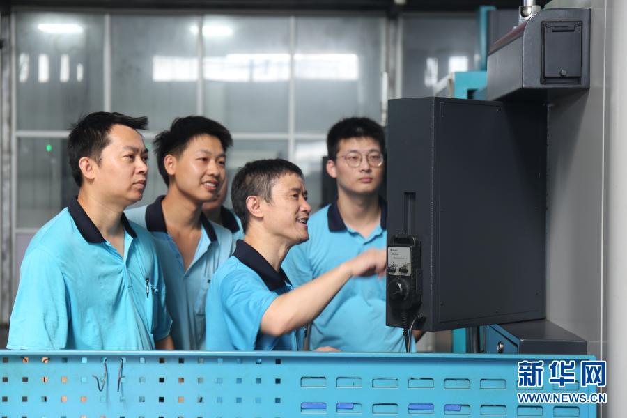 全國(guó)勞動(dòng)模范、寧波中大力德智能傳動(dòng)股份有限公司設(shè)備科科長(zhǎng)萬(wàn)亞勇(右二)在車(chē)間指導(dǎo)員工進(jìn)行數(shù)控機(jī)床故障診斷(8月17日攝)。新華社發(fā)