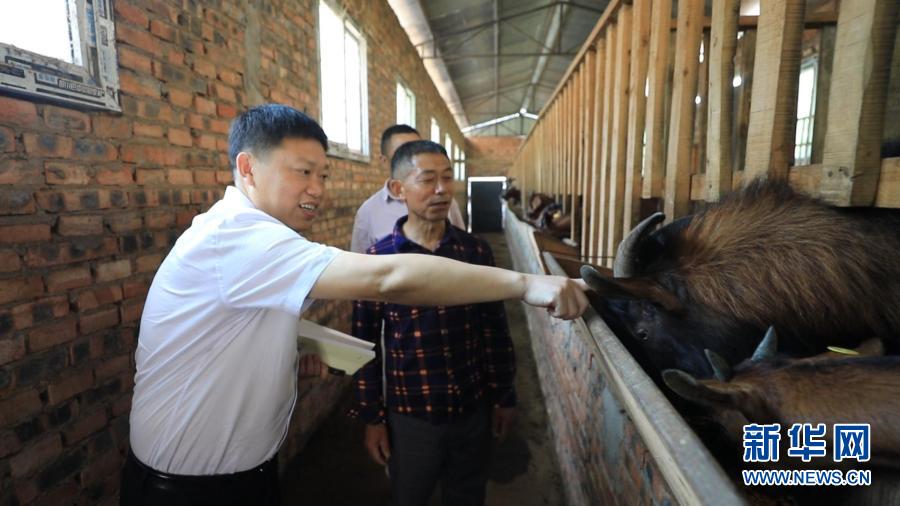 全國(guó)勞動(dòng)模范、四川省南江五郎黃羊養(yǎng)殖專(zhuān)業(yè)合作社理事長(zhǎng)汪其德(左一)在巴中市南江縣紅旗村村民家中指導(dǎo)養(yǎng)羊技術(shù)(資料照片)。新華社發(fā)