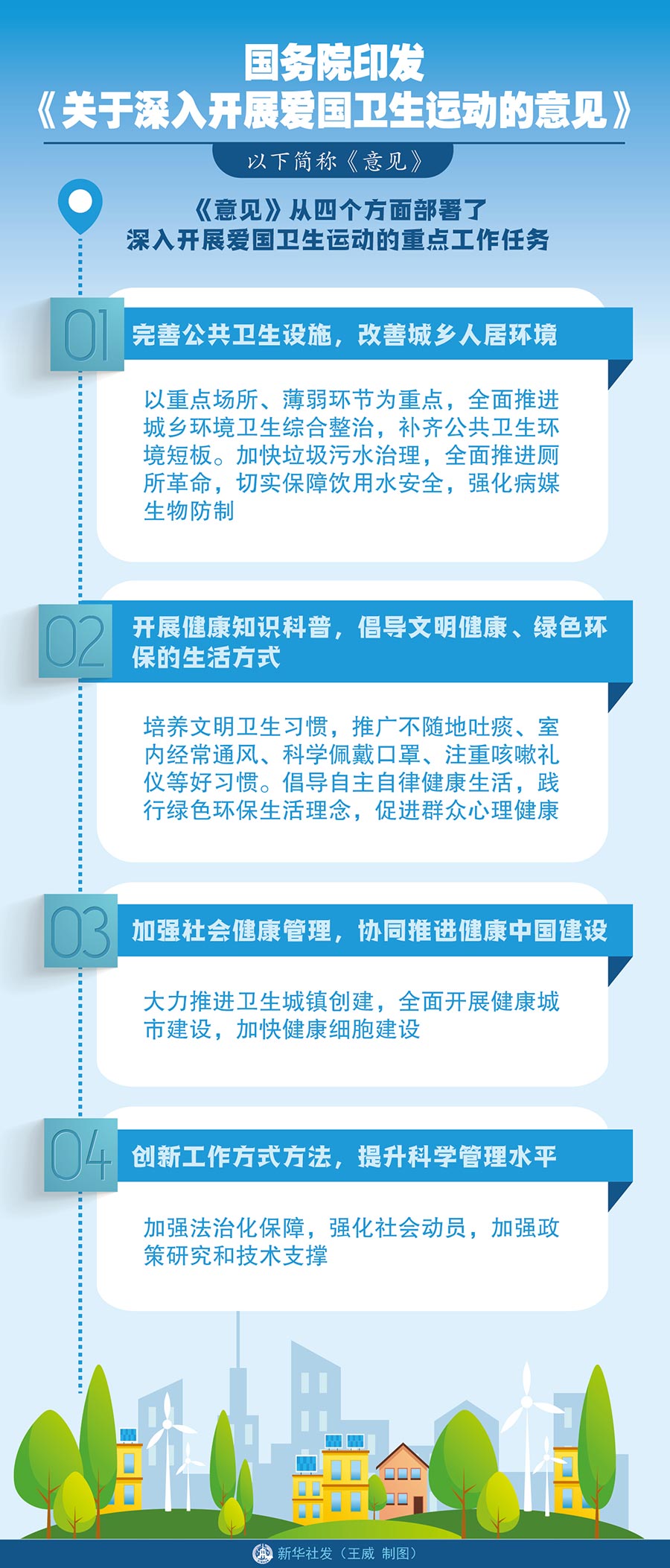 《意見》從四個(gè)方面部署了深入開展愛國衛(wèi)生運(yùn)動(dòng)的重點(diǎn)工作任務(wù)。一是完善公共衛(wèi)生設(shè)施,改善城鄉(xiāng)人居環(huán)境。以重點(diǎn)場(chǎng)所、薄弱環(huán)節(jié)為重點(diǎn),全面推進(jìn)城鄉(xiāng)環(huán)境衛(wèi)生綜合整治,補(bǔ)齊公共衛(wèi)生環(huán)境短板。加快垃圾污水治理,全面推進(jìn)廁所革命,切實(shí)保障飲用水安全,強(qiáng)化病媒生物防制。二是開展健康知識(shí)科普,倡導(dǎo)文明健康、綠色環(huán)保的生活方式。培養(yǎng)文明衛(wèi)生習(xí)慣,推廣不隨地吐痰、室內(nèi)經(jīng)常通風(fēng)、科學(xué)佩戴口罩、注重咳嗽禮儀等好習(xí)慣。倡導(dǎo)自主自律健康生活,踐行綠色環(huán)保生活理念,促進(jìn)群眾心理健康。三是加強(qiáng)社會(huì)健康管理,協(xié)同推進(jìn)健康中國建設(shè)。大力推進(jìn)衛(wèi)生城鎮(zhèn)創(chuàng)建,全面開展健康城市建設(shè),加快健康細(xì)胞建設(shè)。四是創(chuàng)新工作方式方法,提升科學(xué)管理水平。加強(qiáng)法治化保障,強(qiáng)化社會(huì)動(dòng)員,加強(qiáng)政策研究和技術(shù)支撐。