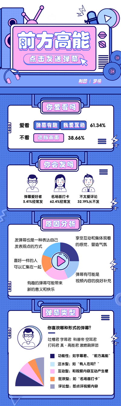 中青校媒調(diào)查顯示,受訪大學(xué)生對(duì)不同類型的“彈幕君”喜好程度不一,其中“科普帝”以59.66%位列排行榜第一,“真·高能君”占52.77%,“字幕君”占52%,之后依次是“吐槽君”“激燃刷屏團(tuán)”“空耳君”“打碼君”,分別占42.7%、19.06%、12.13%和7.86%。