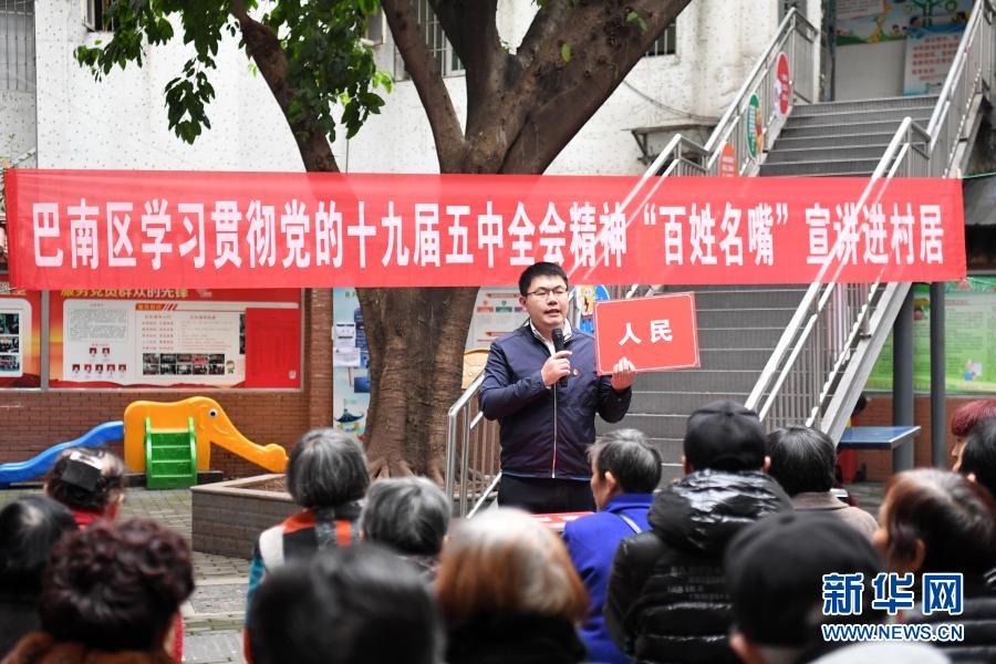 12月1日,宣講員向群眾宣講黨的十九屆五中全會(huì)精神。12月1日,重慶市巴南區(qū)魚(yú)洞街道魚(yú)新街社區(qū)舉行學(xué)習(xí)貫徹黨的十九屆五中全會(huì)精神“百姓名嘴”進(jìn)村居活動(dòng)。據(jù)介紹,重慶市巴南區(qū)“百姓名嘴”宣講團(tuán)是由基層干部、教師、民間藝人等基層理論骨干自愿組成的理論宣講隊(duì)伍,現(xiàn)有宣講員85名。宣講團(tuán)成員將理論宣講與評(píng)書(shū)、快板、三句半、木洞山歌等文藝形式相結(jié)合,目前已在巴南區(qū)開(kāi)展了110余場(chǎng)學(xué)習(xí)貫徹黨的十九屆五中全會(huì)精神宣講活動(dòng)。新華社記者 唐奕 攝