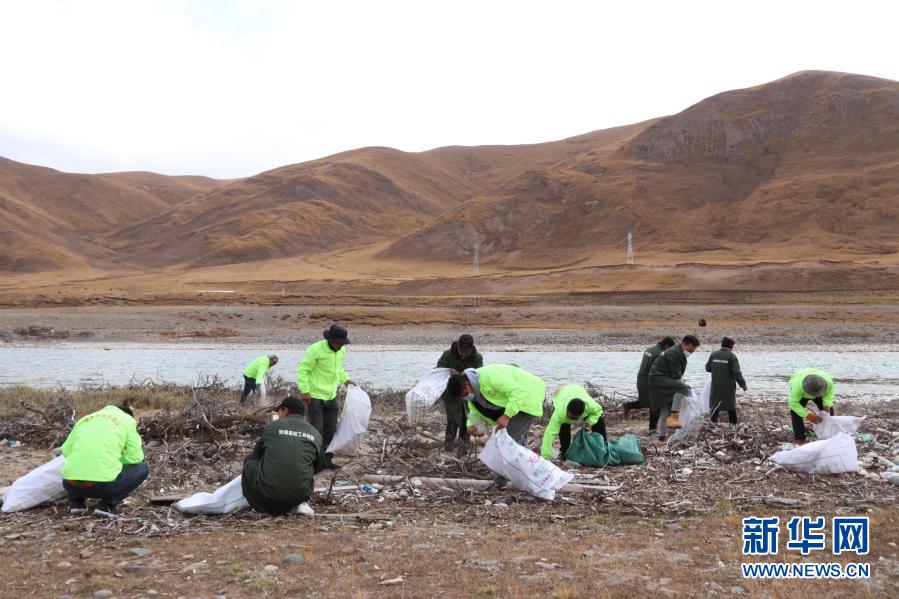 三江源國家公園治多生態(tài)環(huán)保協(xié)會(huì)的志愿者在清理河道內(nèi)的垃圾(7月11日攝)。新華社發(fā)