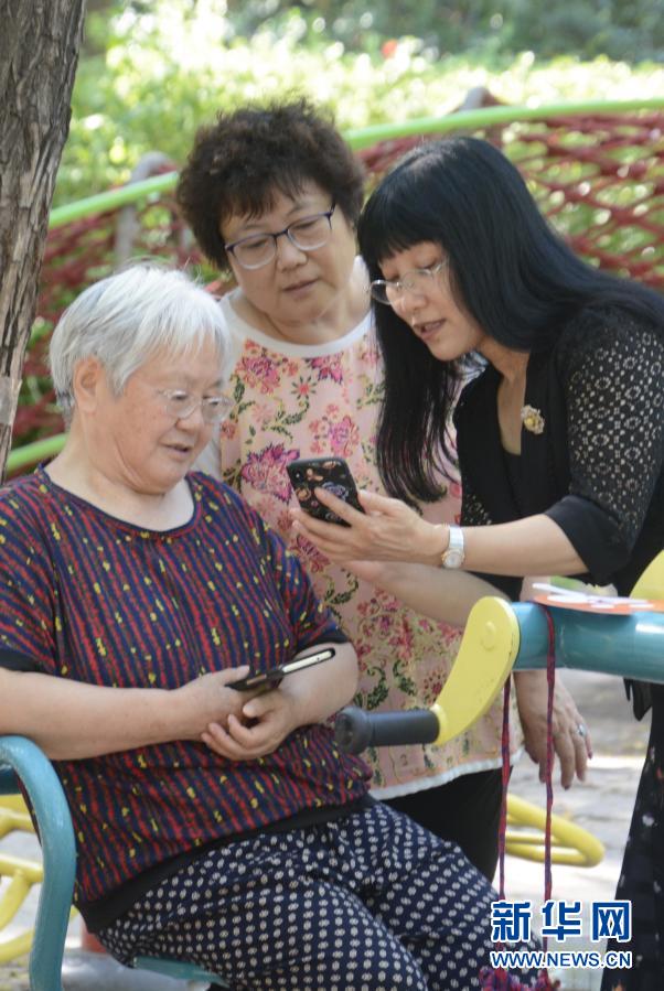 龍澤苑社區(qū)黨支部書記、居委會(huì)主任伊然(右)在社區(qū)內(nèi)教老年人使用手機(jī)里的社區(qū)服務(wù)軟件(8月10日攝)。新華社記者 李欣 攝