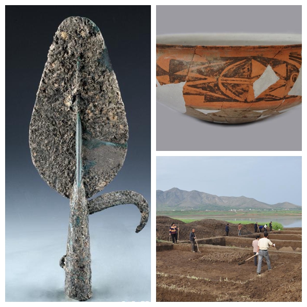 左圖為河南省淅川縣下王崗遺址出土的龍山文化時期銅矛;右上圖為河南省淅川縣下王崗遺址出土的仰韶文化時期陶器;右下圖為河南省淅川縣下王崗遺址發(fā)掘現(xiàn)場