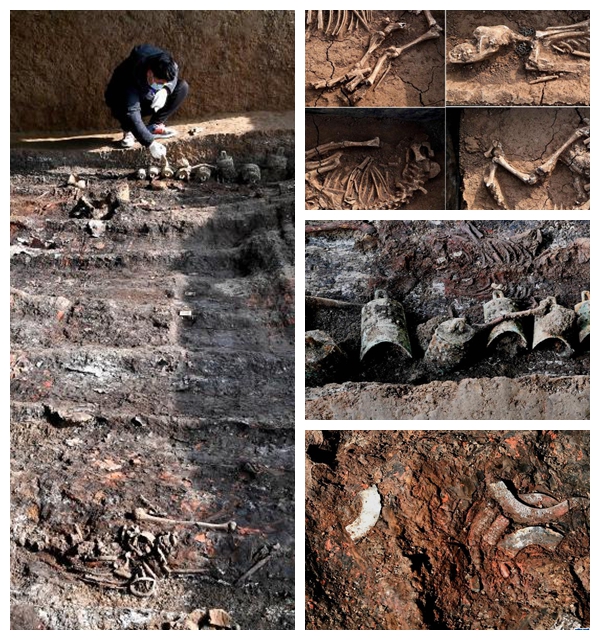左圖為工作人員在清理河南洛陽徐陽墓地標號為M15的墓葬;右上圖為河南洛陽徐陽墓地標號為M15的墓葬周邊祭祀遺存內(nèi)出土的動物遺骸;右中圖為河南洛陽徐陽墓地標號為M15的墓葬出土的編鐘;右下圖為河南洛陽徐陽墓地標號為M15的墓葬出土的玉璜