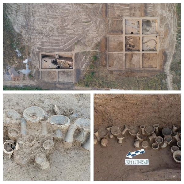 上圖為余莊遺址發(fā)掘區(qū)航拍圖(11月3日攝,無人機照片);左下圖為余莊遺址標號為T0405的探方出土的陶器;右下圖為余莊遺址標號為M10的墓葬出土的隨葬陶器