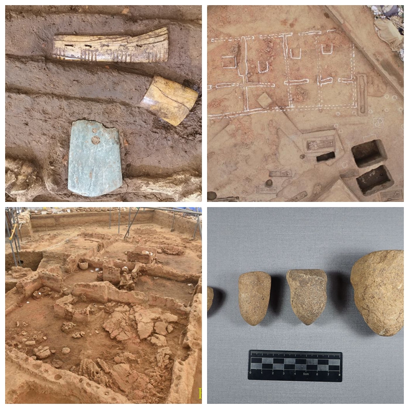 ?左上圖為屈家?guī)XM77中象牙弓飾玉鉞骨樽;右上圖為黃山遺址部分發(fā)掘現(xiàn)場航拍圖;左下圖為黃山遺址出土的仰韶文化晚期的大型玉石器生產(chǎn)作坊;右下圖為黃山遺址出土的石質(zhì)制玉工具——系列石鉆