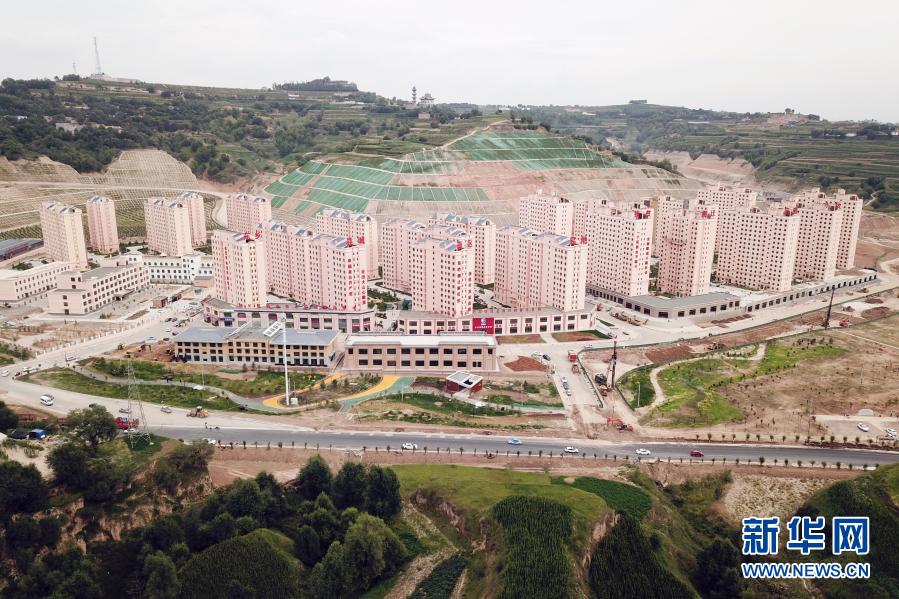 這是8月3日在東鄉(xiāng)族自治縣拍攝的縣城南區(qū)易地扶貧搬遷安置小區(qū)(無人機照片)。新華社記者 范培珅 攝