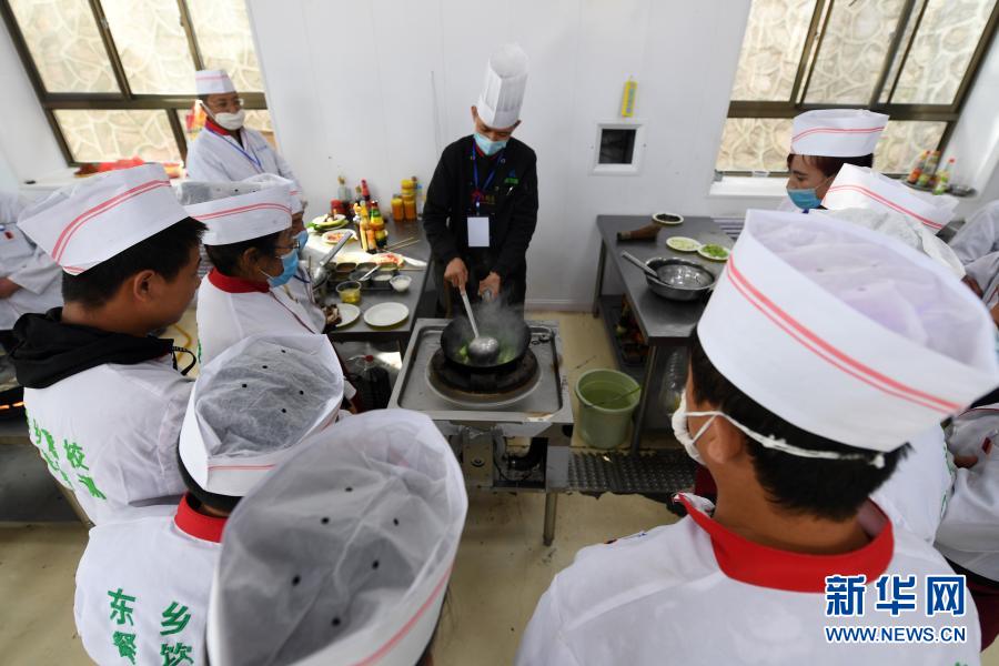東鄉(xiāng)縣職業(yè)技術(shù)學(xué)校中式烹飪培訓(xùn)班學(xué)員在上實操課(4月21日攝)。新華社記者 范培珅 攝