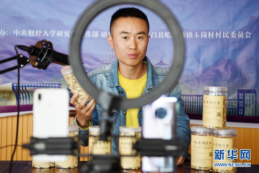 在宕昌縣哈達(dá)鋪鎮(zhèn)藥鄉(xiāng)農(nóng)民專業(yè)合作社聯(lián)合社,工作人員網(wǎng)絡(luò)直播賣藥材(9月18日攝)。新華社記者 范培珅 攝