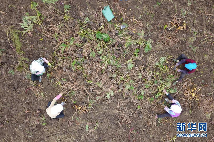 在宕昌縣拉路梁中藥材標(biāo)準(zhǔn)化種植示范基地,村民收獲藥材(9月18日攝,無人機照片)。新華社記者 范培珅 攝
