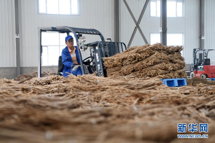 在宕昌縣哈達(dá)鋪琦昆現(xiàn)代中藥材倉儲物流基地,工作人員使用叉車搬運中藥材(9月18日攝)。新華社記者 范培珅 攝