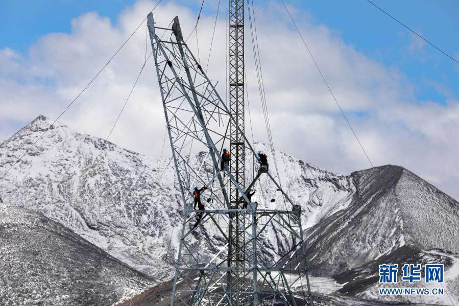在西藏日喀則市定日縣,施工人員在西藏阿里與藏中電網(wǎng)聯(lián)網(wǎng)工程線路4標(biāo)段作業(yè)(4月28日攝)。新華社發(fā)