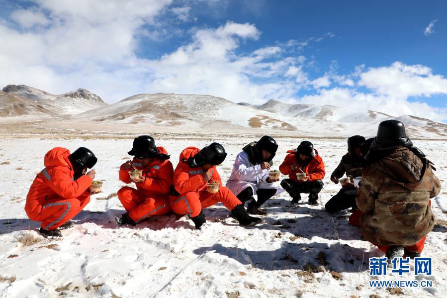 在西藏阿里地區(qū)噶爾縣,施工人員在西藏阿里與藏中電網(wǎng)聯(lián)網(wǎng)工程線路13標(biāo)段吃午飯(2019年12月21日攝)。新華社發(fā)