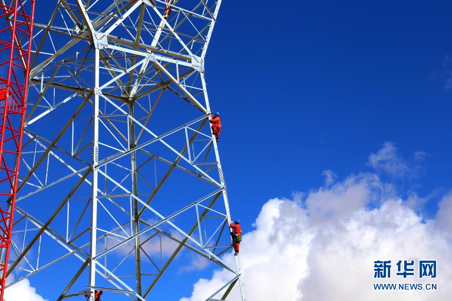 在西藏阿里地區(qū)噶爾縣,施工人員在西藏阿里與藏中電網(wǎng)聯(lián)網(wǎng)工程線路13標(biāo)段進(jìn)行組塔作業(yè)(3月29日攝)。新華社發(fā)