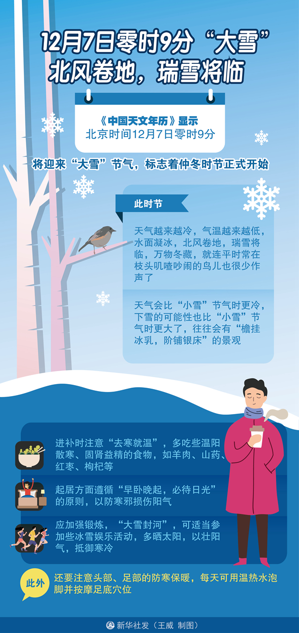 新華社天津12月5日電(記者周潤(rùn)?。耙股钪┲兀瑫r(shí)聞?wù)壑衤??!薄吨袊?guó)天文年歷》顯示,北京時(shí)間12月7日零時(shí)9分將迎來“大雪”節(jié)氣,標(biāo)志著仲冬時(shí)節(jié)正式開始。此時(shí)節(jié),天氣越來越冷,氣溫越來越低,水面凝冰,北風(fēng)卷地,瑞雪將臨,萬物冬藏,就連平時(shí)常在枝頭嘰喳吵鬧的鳥兒也很少作聲了。