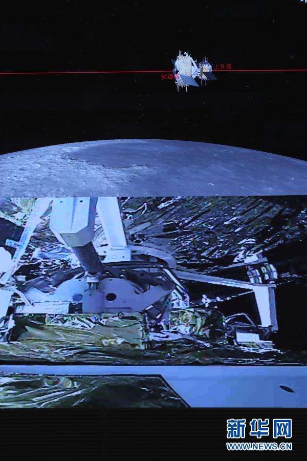 這是12月6日在北京航天飛行控制中心指揮大廳拍攝的嫦娥五號上升器與軌道器返回器組合體交會對接畫面。