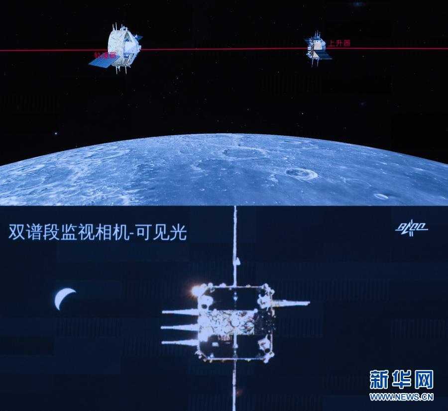 記者從國家航天局獲悉,12月6日5時(shí)42分,嫦娥五號上升器成功與軌道器返回器組合體交會(huì)對接,并于6時(shí)12分將月球樣品容器安全轉(zhuǎn)移至返回器中。這是我國航天器首次實(shí)現(xiàn)月球軌道交會(huì)對接。新華社記者 金立旺 攝