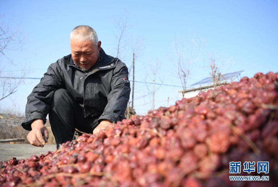 河北省阜平縣東城鋪村建檔立卡貧困戶劉國(guó)旗在家中挑揀晾曬的大棗(11月25日攝)。新華社記者 朱旭東 攝