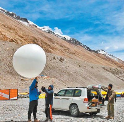 西藏自治區(qū)氣象局2020珠峰高程測量氣象探測保障服務(wù)隊(duì)施放高空氣象探測氣球。自然資源部供圖