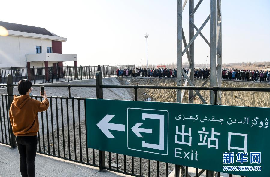 12月9日,在位于新疆尉犁縣境內(nèi)的庫(kù)爾木依站,當(dāng)?shù)鼐用褡园l(fā)地來(lái)到車站外圍觀列車。新華社記者 王菲 攝