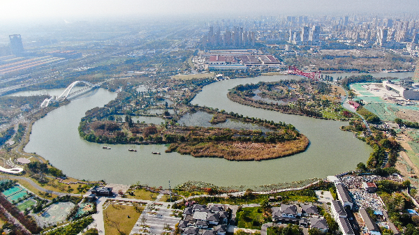 這是11月14日拍攝的江蘇省揚(yáng)州市運(yùn)河三灣生態(tài)文化公園景色(無(wú)人機(jī)照片)。新華社記者 季春鵬 攝