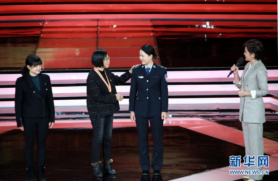 張桂梅(左)在“時(shí)代楷模”發(fā)布儀式上與主持人交流(12月7日攝)。新華社記者 潘旭 攝