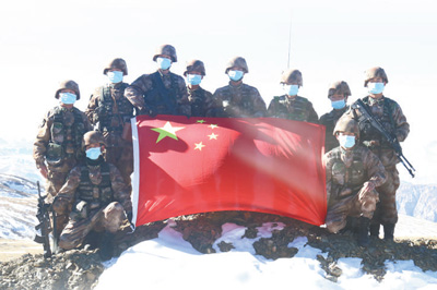 “里孜戍邊模范連”官兵巡邏到達界碑前,向國旗宣誓并合影留念。 鄔 軍攝