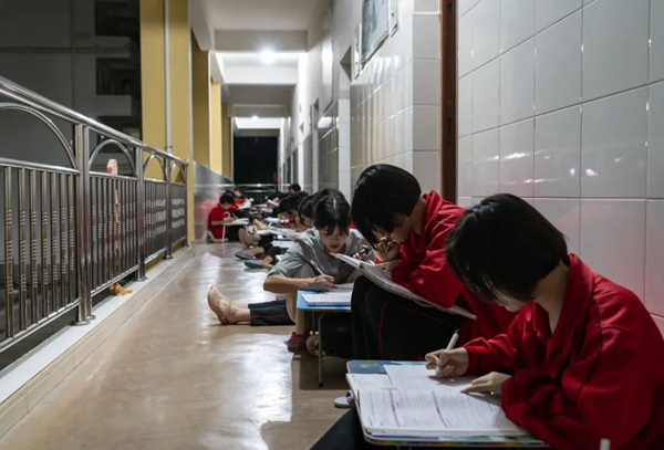 子夜時(shí)分,華坪女高的宿舍樓樓道內(nèi)燈火通明,學(xué)生在樓道里支起小桌,席地而坐,老師在樓道內(nèi)來回巡視,為學(xué)生答疑解惑。