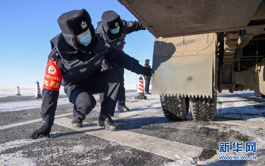12月15日,內(nèi)蒙古烏蘭察布邊境管理支隊腦木更邊境派出所民警在主著陸場區(qū)附近檢查來往車輛。新華社記者 連振 攝