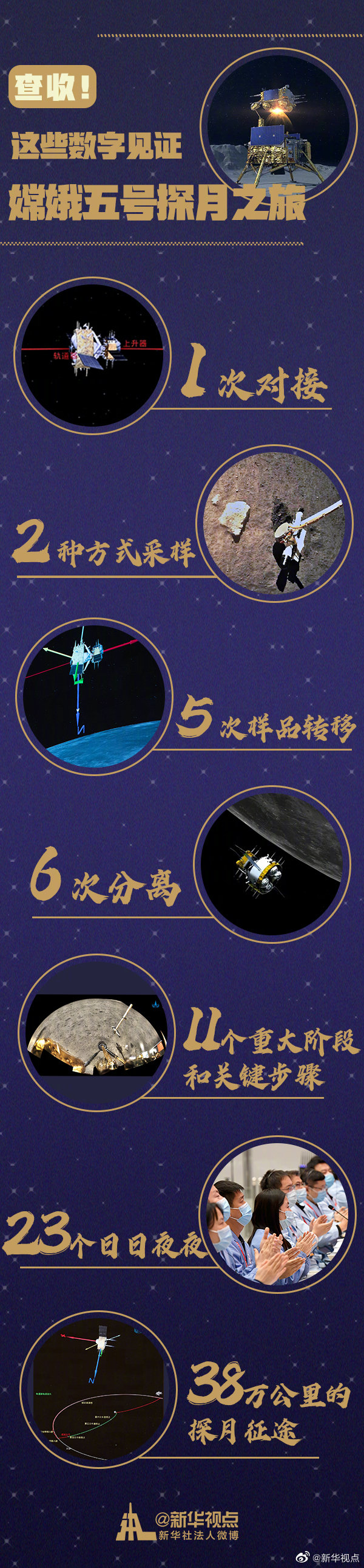 1、2、5、6、11、23、38……1次對接,2種方式采樣,5次樣品轉(zhuǎn)移,6次分離,11個(gè)重大階段和關(guān)鍵步驟,23個(gè)日日夜夜,38萬公里的探月征途!轉(zhuǎn)發(fā)!收藏!