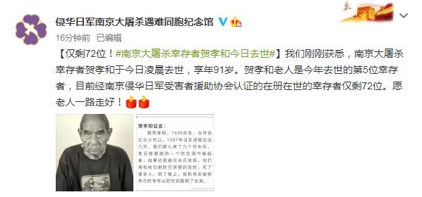 據(jù)侵華日軍南京大屠殺遇難同胞紀念館官方微博消息,南京大屠殺幸存者賀孝和于今日凌晨去世,享年91歲。賀孝和老人是今年去世的第5位幸存者,目前經南京侵華日軍受害者援助協(xié)會認證的在冊在世的幸存者僅剩72位。