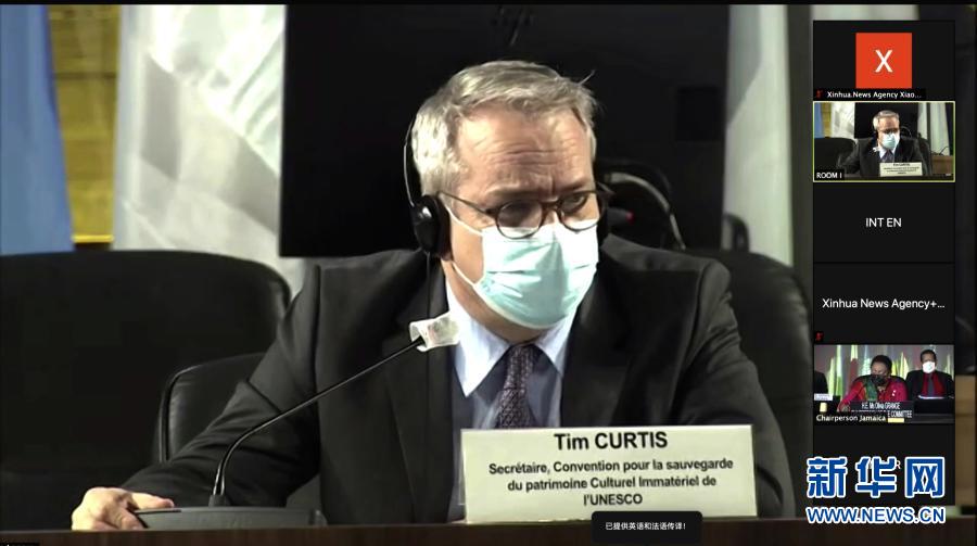 這張12月18日的視頻截圖顯示的是,聯合國教科文組織《保護非物質文化遺產公約》秘書蒂姆·柯蒂斯在法國巴黎參加線上視頻會議。新華社發(fā)
