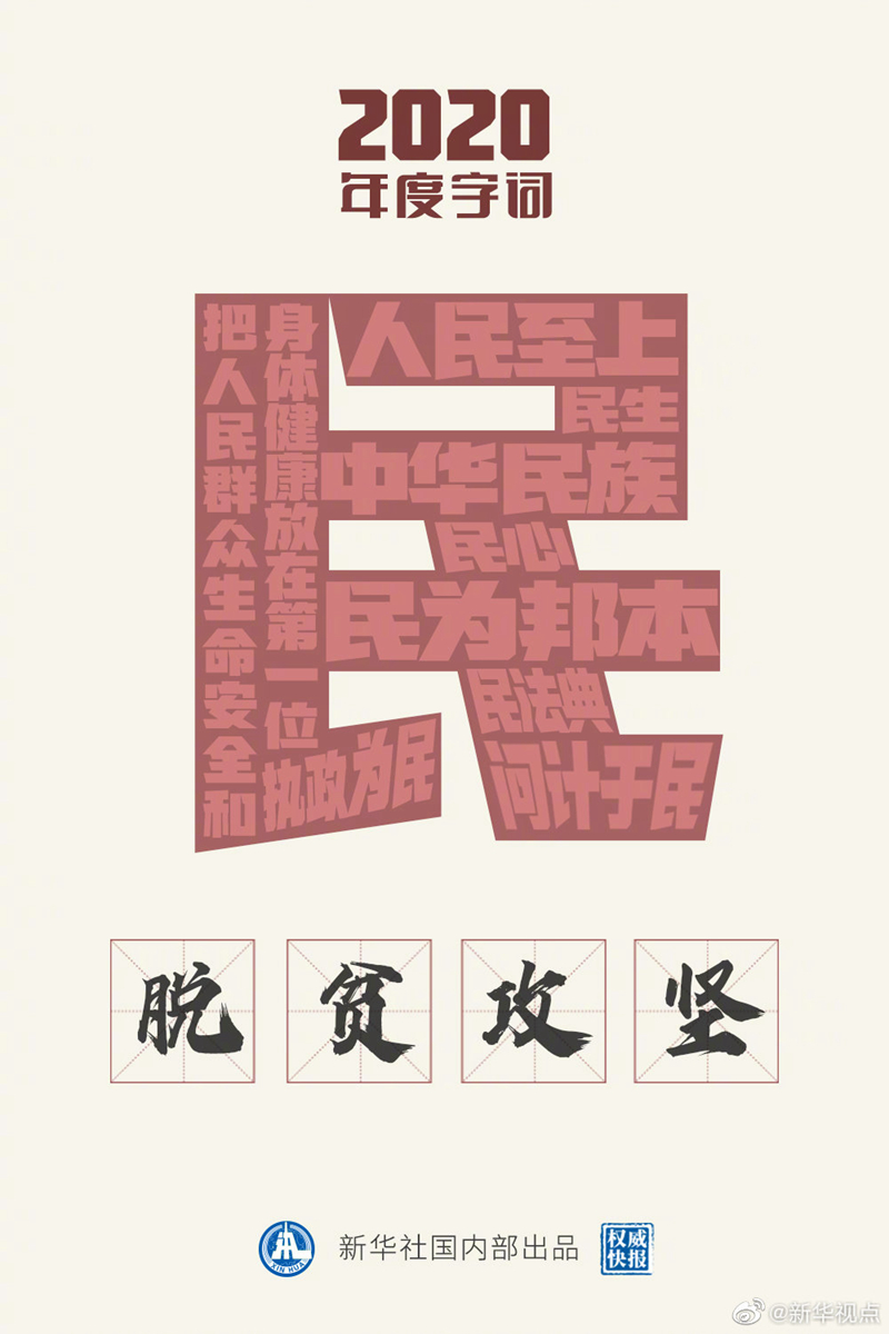 “民”當(dāng)選2020年度“國內(nèi)字”;“脫貧攻堅”當(dāng)選2020年度“國內(nèi)詞”。國家語言資源監(jiān)測與研究中心、商務(wù)印書館等21日發(fā)布“漢語盤點2020”年度字詞,定格我國年度記憶。這一年,從抗疫抗洪到民法典誕生、謀劃開啟“十四五”新征程,處處閃耀“人民至上”理念;這一年,如期完成脫貧攻堅目標(biāo)任務(wù),千年夙愿,今朝夢圓!?