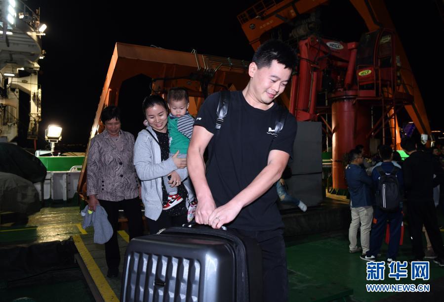 12月21日,“奮斗者”號海試保障母船“探索二號”靠泊三亞,科考隊員和前來迎接的家屬一起離船。新華社記者 趙穎全 攝