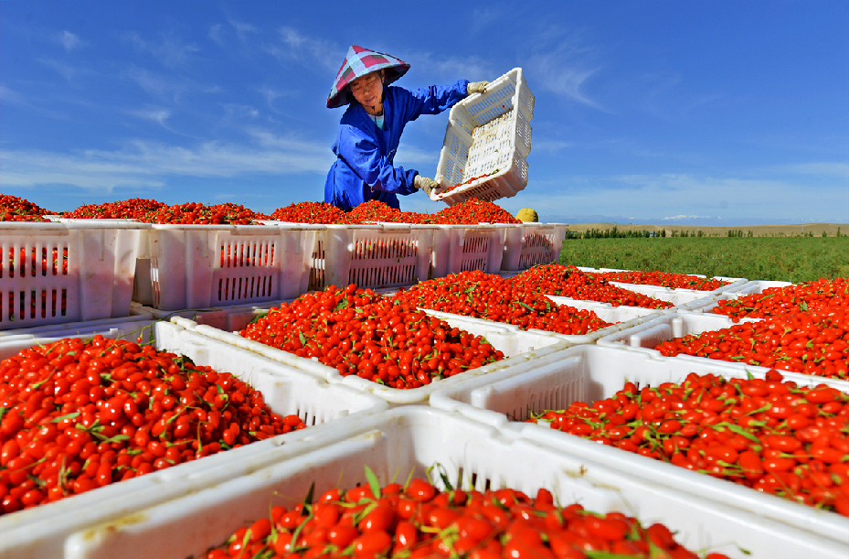 ????2020年7月19日,在甘肅省張掖市高臺(tái)縣黑泉鎮(zhèn)十壩村戈壁灘上,農(nóng)民正在將采摘成框的枸杞裝車(chē)。鄭耀德 攝