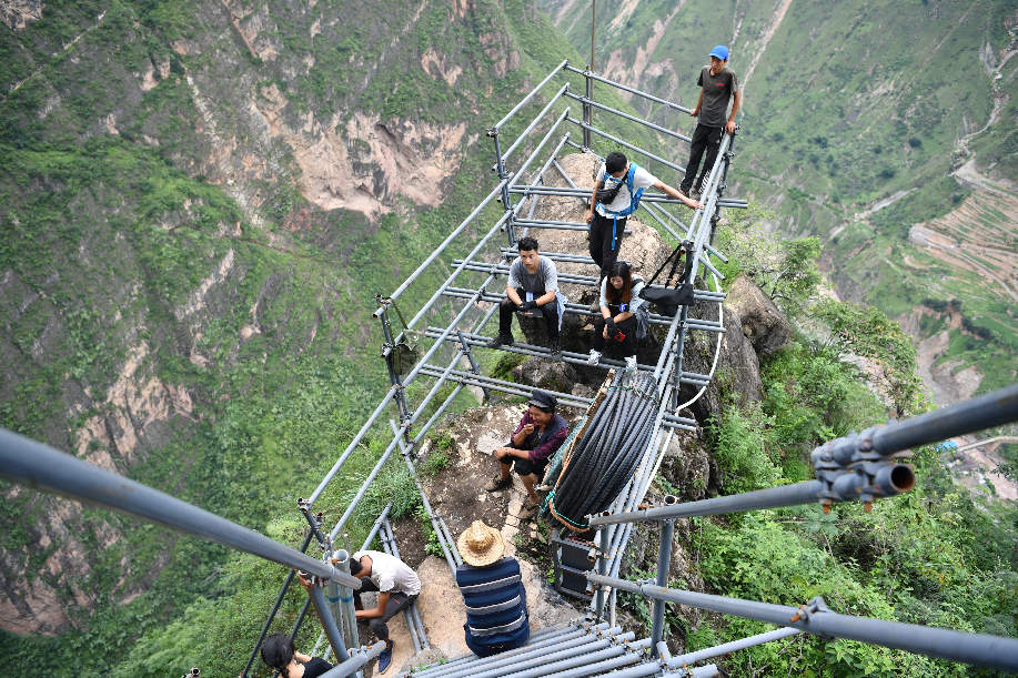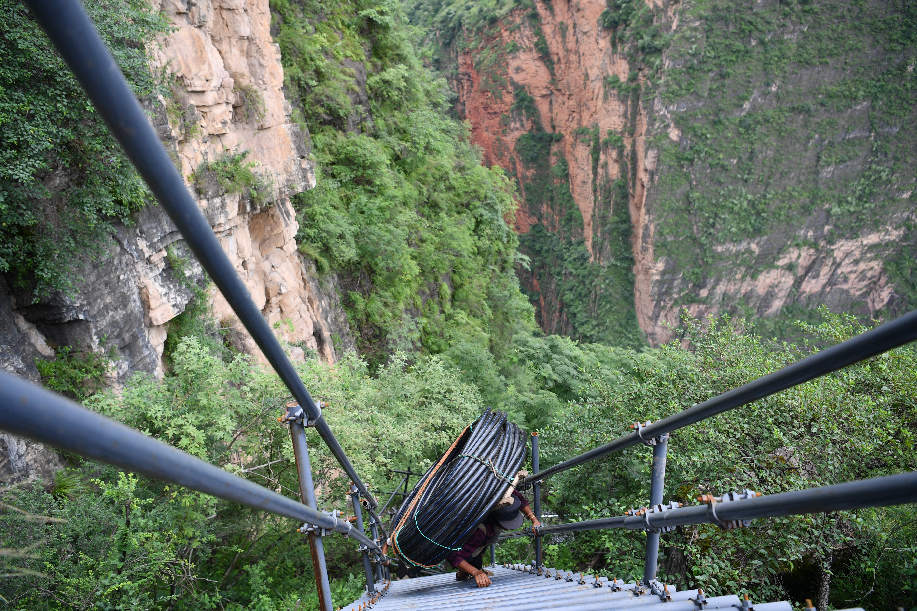 2017年9月初,四川涼山“懸崖村”村民背貨物通過天梯上山。四川省涼山州昭覺縣支爾莫鄉(xiāng)阿土列爾村,坐落于海拔約1600米的山坳中,從山底到山頂村莊海拔高差近1000米,村民往返村子都需要借助懸崖峭壁間的天梯,從而被稱為“懸崖村”。為緩解村民出行險的問題,當(dāng)?shù)赝度?20噸鋼材、共6000根鋼管修筑了2556級“鋼管天梯”,工程于2017年6月底徹底完工,如今,“鋼管天梯”已經(jīng)取代了之前更危險的藤梯,成為村民通往外界唯一的道路。 張浪 攝