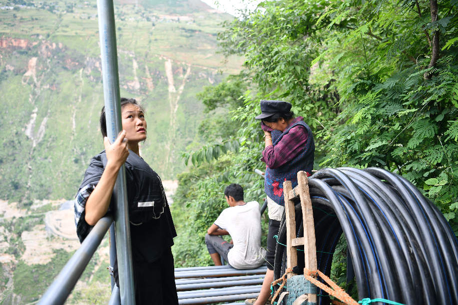 ????2017年9月初,四川涼山“懸崖村”村民背貨物通過天梯上山,中途休息。四川省涼山州昭覺縣支爾莫鄉(xiāng)阿土列爾村,坐落于海拔約1600米的山坳中,從山底到山頂村莊海拔高差近1000米,村民往返村子都需要借助懸崖峭壁間的天梯,從而被稱為“懸崖村”。為緩解村民出行險的問題,當(dāng)?shù)赝度?20噸鋼材、共6000根鋼管修筑了2556級“鋼管天梯”,工程于2017年6月底徹底完工,如今,“鋼管天梯”已經(jīng)取代了之前更危險的藤梯,成為村民通往外界唯一的道路。 張浪 攝