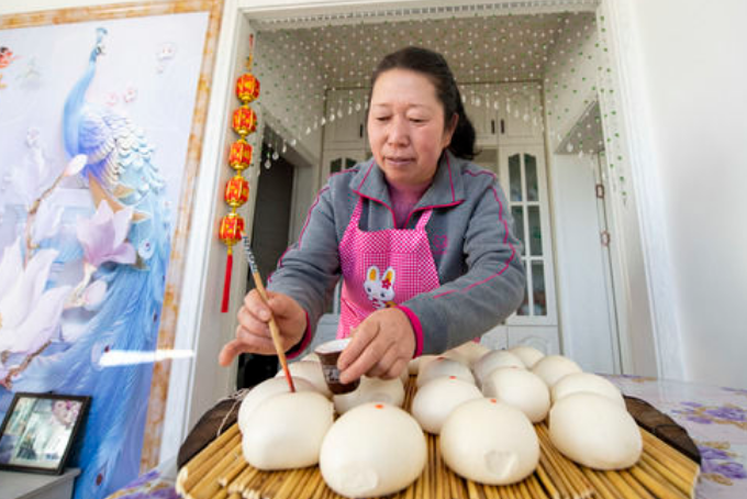 12月31日,李三花在蒸好的饅頭上點紅點。新華社記者 楊晨光 攝