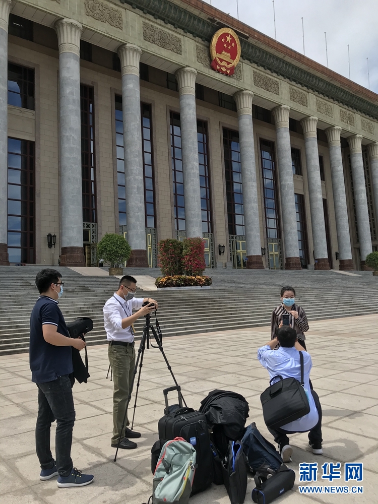 5月20日,全國政協(xié)十三屆三次會(huì)議召開新聞發(fā)布會(huì)。大會(huì)新聞發(fā)言人郭衛(wèi)民向中外媒體介紹本次大會(huì)有關(guān)情況并回答記者提問。圖為本網(wǎng)記者在人民大會(huì)堂東門外廣場做直播前準(zhǔn)備工作。新華網(wǎng)記者 周紅軍? 攝