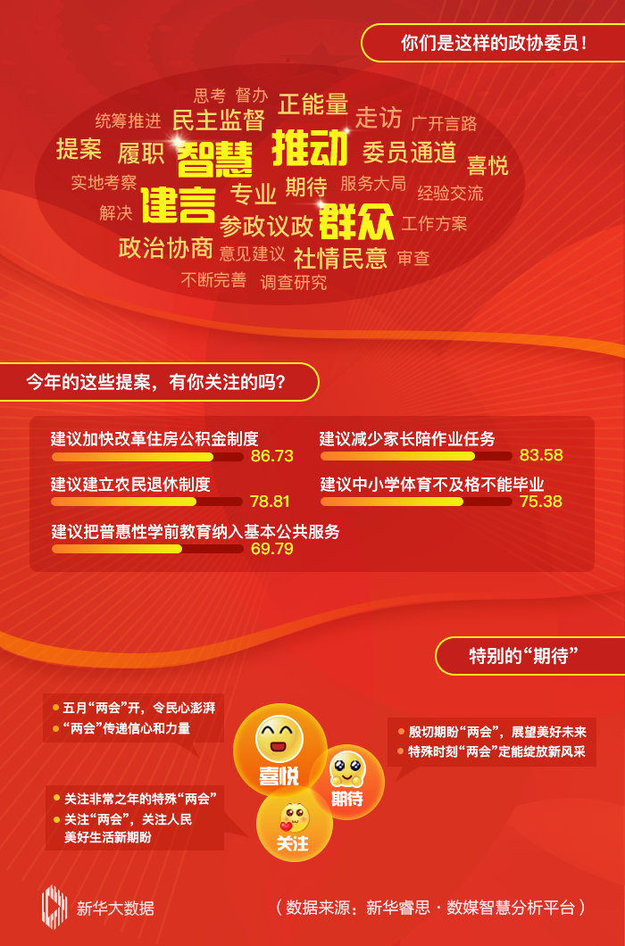 今年的提案,哪些“戳”中你的心?本周,隨著全國政協(xié)十三屆三次會議開幕時間的臨近,全國政協(xié)委員的提案持續(xù)引發(fā)輿論關(guān)注。其中,“加快改革住房公積金制度”“減少家長陪作業(yè)任務(wù)”等提案的討論熱度較高。網(wǎng)民說,委員的提案切實讓人民大眾感受到“兩會溫暖”。