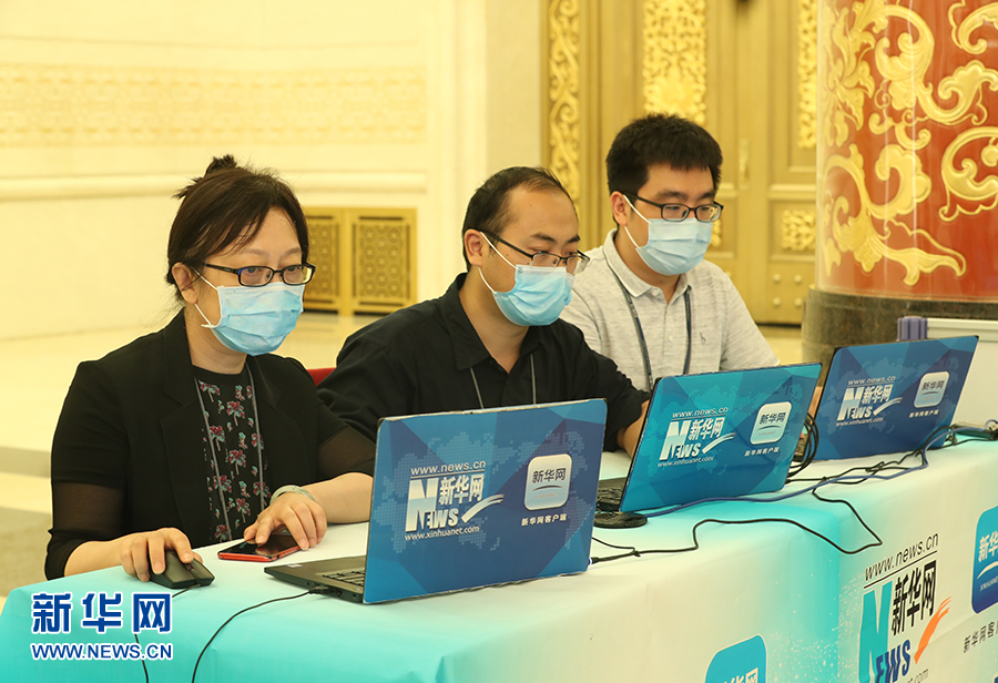 2020年5月28日下午十三屆全國人大三次會議閉幕后,國務(wù)院總理李克強在人民大會堂三樓金色大廳出席記者會并回答中外記者提問。為有效防控疫情,共同維護公共衛(wèi)生與健康,記者會采用網(wǎng)絡(luò)視頻形式進行。圖為新華網(wǎng)現(xiàn)場直播團隊。 新華網(wǎng) 王翰林 攝