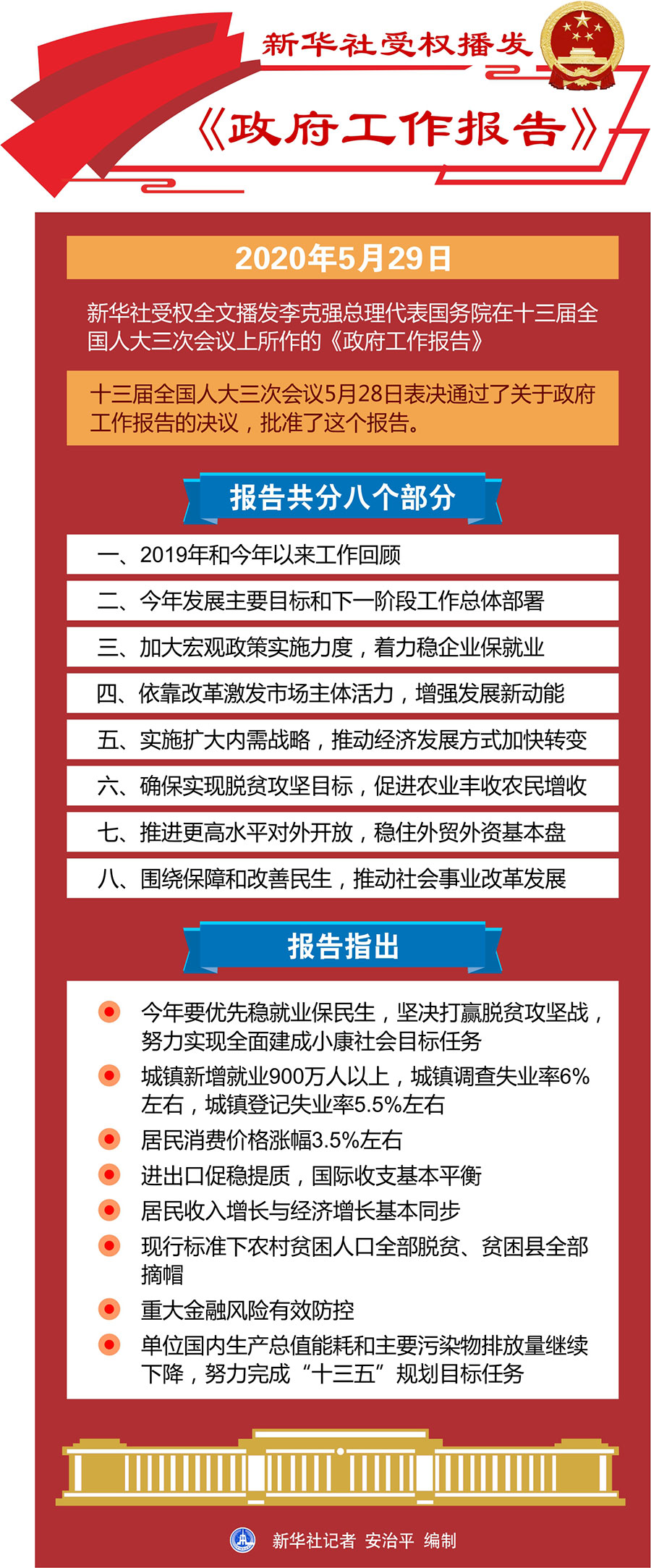 報告共分八個部分:一、2019年和今年以來工作回顧;二、今年發(fā)展主要目標(biāo)和下一階段工作總體部署;三、加大宏觀政策實施力度,著力穩(wěn)企業(yè)保就業(yè);四、依靠改革激發(fā)市場主體活力,增強(qiáng)發(fā)展新動能;五、實施擴(kuò)大內(nèi)需戰(zhàn)略,推動經(jīng)濟(jì)發(fā)展方式加快轉(zhuǎn)變;六、確保實現(xiàn)脫貧攻堅目標(biāo),促進(jìn)農(nóng)業(yè)豐收農(nóng)民增收;七、推進(jìn)更高水平對外開放,穩(wěn)住外貿(mào)外資基本盤;八、圍繞保障和改善民生,推動社會事業(yè)改革發(fā)展。