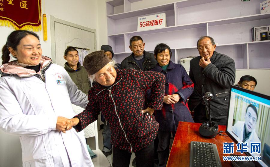 2020年12月3日,安徽省金寨縣大灣村村民方臨芳(左二)指著自己身體疼痛的部位,在村醫(yī)袁玲(左一)的幫助下向5G遠(yuǎn)程醫(yī)療會診的專家講述病情。